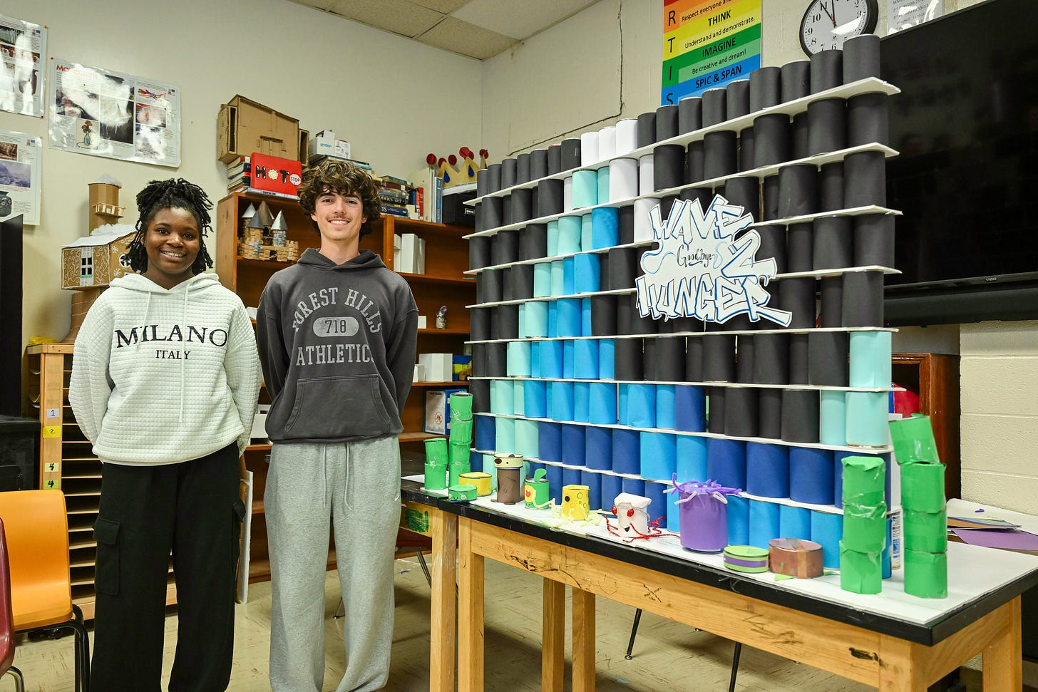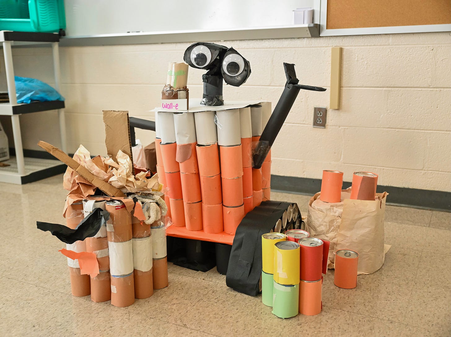 Roughly 45 students, led by art and theater teacher Amber Hyatt-Lisk, created a large-scale version of WALL-E, the beloved robot from the 2008 Disney/Pixar film. The structure, made from 192 cans, was inspired by eighth grader Pax Melton.