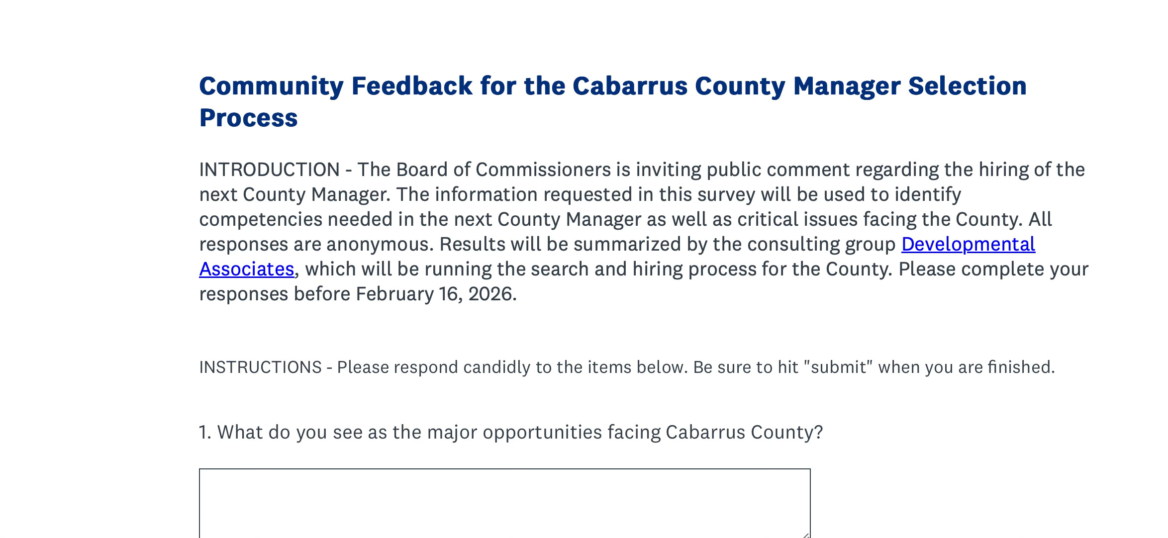 An anonymous survey asks residents to weigh in on priorities, challenges and leadership qualities for the county’s next top administrator, with responses due by Feb. 16.