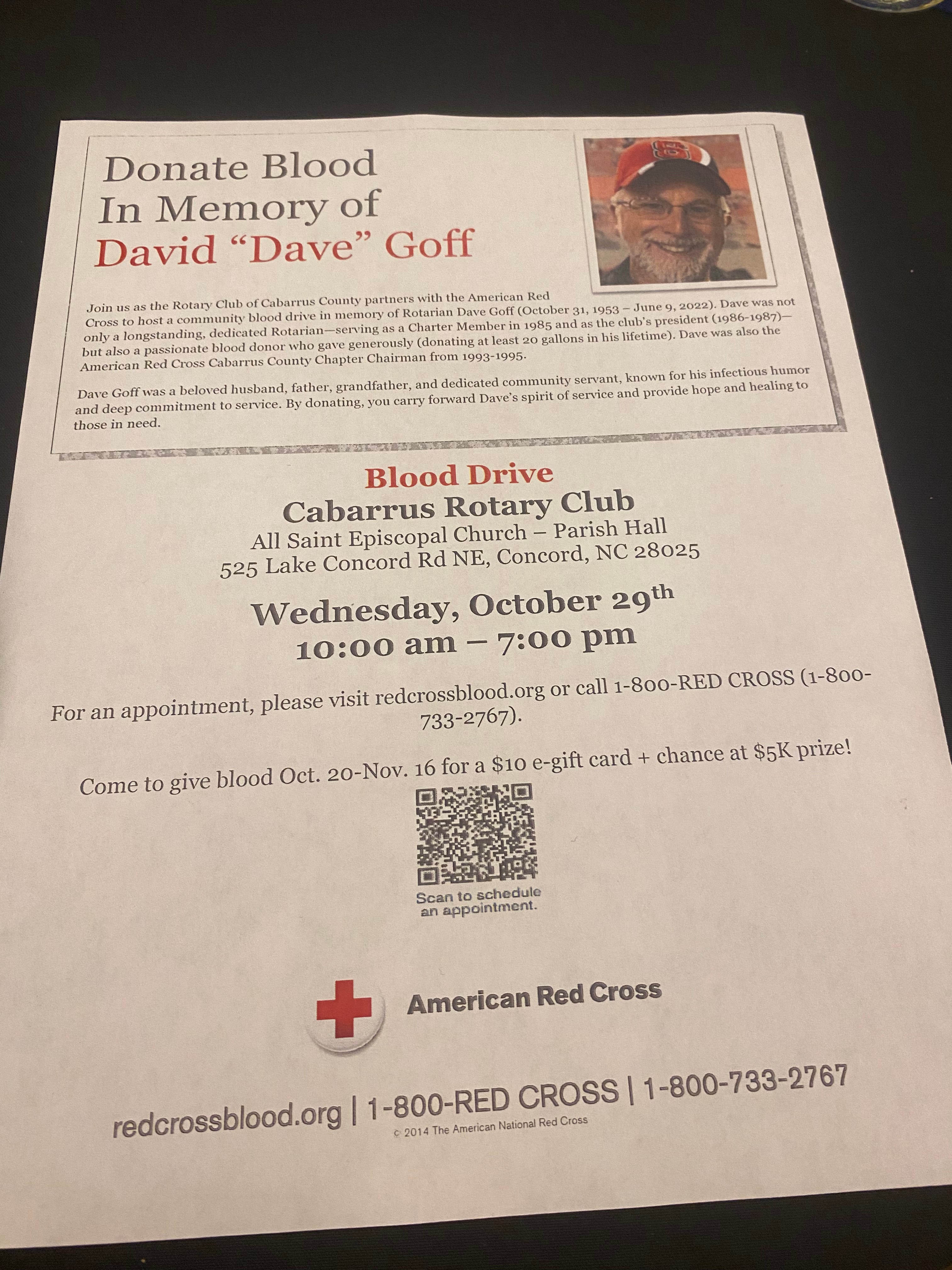 When it comes to deciding how best to serve, many members look to the example of the late Dave Goff, a founding member and passionate blood donor who gave 20 gallons during his lifetime. Goff also chaired the Cabarrus County chapter of the American Red Cross.