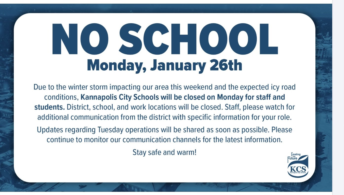 Kannapolis City Schools will be closed on Monday, Jan. 26, for both staff and students as Winter Storm Fern continues to bring snow, sleet and freezing rain to the region.