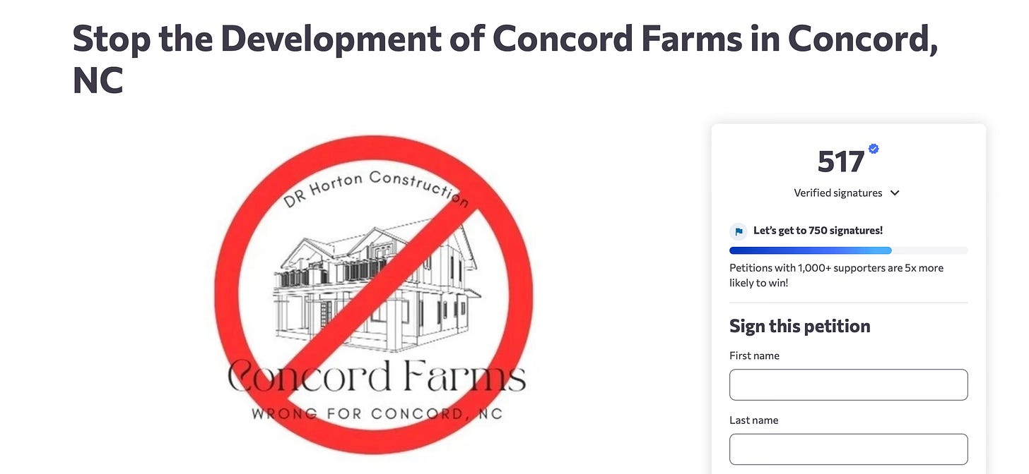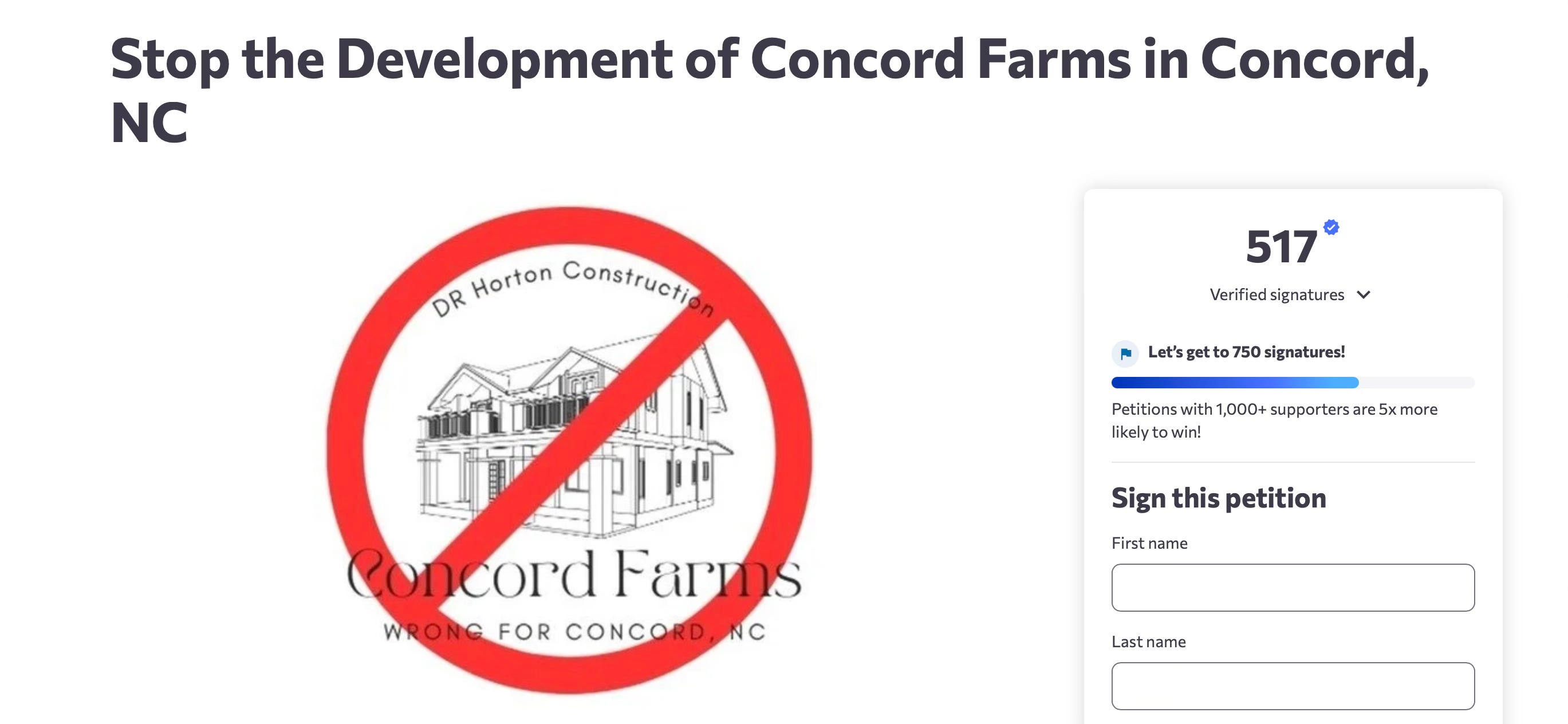 A newly launched Change.org petition is calling on the City of Concord to reject D.R. Horton’s ambitious plan to transform 550 acres at George W. Liles Parkway and Weddington Road into a sprawling mixed-use community.