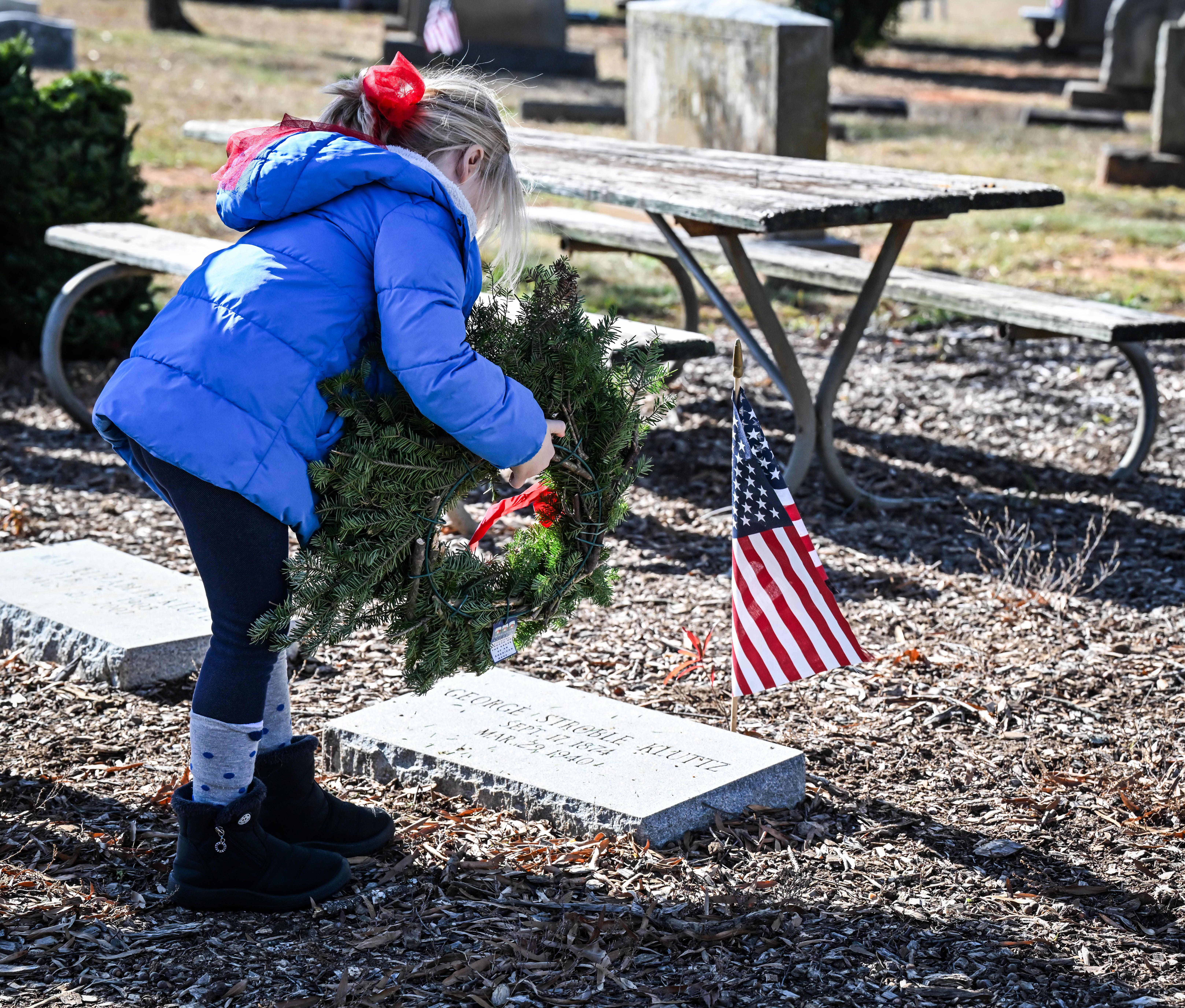 A young girl lays a wreath by the grave of a military veteran Saturday at Oakwood Cemetery. Photo credit: Michael Anderson.